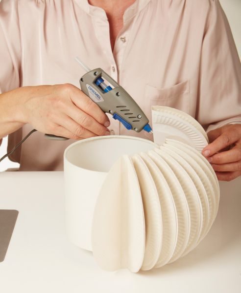 Em seguida, aplique cola quente na dobra do pratinho e cole na cúpula do abajur ou da luminária.