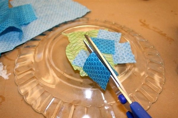 Agora, siga fixando mais pedaços de tecido sobre o fundo do prato.