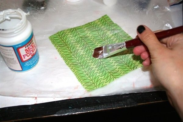 Comece separando todos os materiais que você vai utilizar em seu artesanato. Depois separe os retalhos de tecido que você vai utilizar em seu artesanato e aplique cola para decoupage sobre toda a parte do direito dos tecidos escolhidos. Espere a cola secar por no mínimo vinte minutos antes de cortar cada tecido.