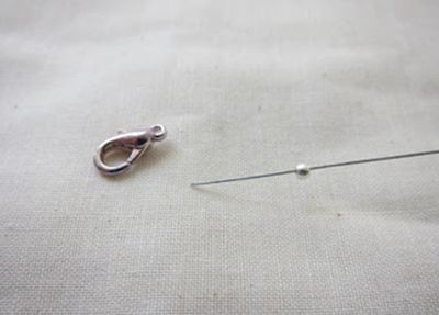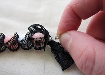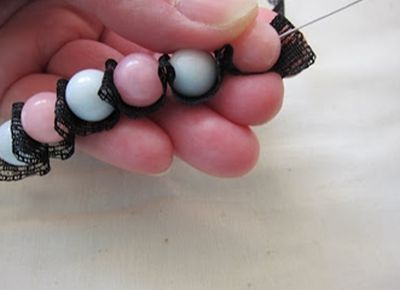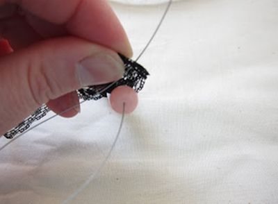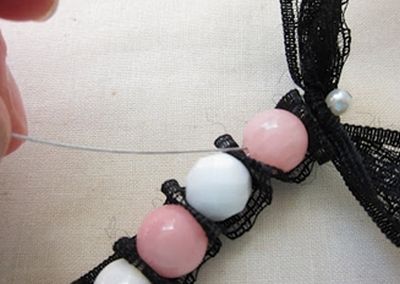 Logo após, passe a ponta da fita de renda pelo arame. Depois passe a primeira pérola escolhida.