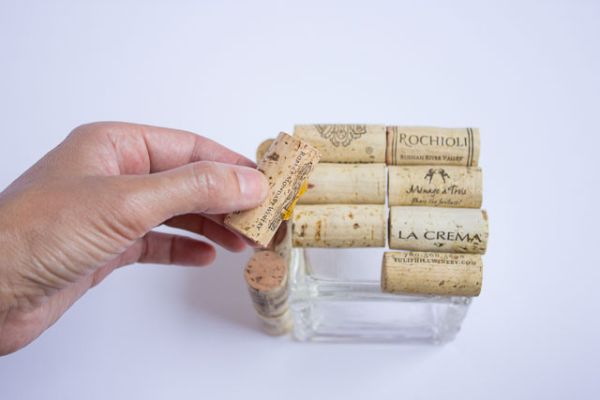 Logo após, comece a colar as rolhas nas laterais do vaso, posicionando algumas rolhas em posição vertical nos cantos do vaso e colando outras rolhas na posição horizontal, as rolhas que irão revestir os lados do vaso.
