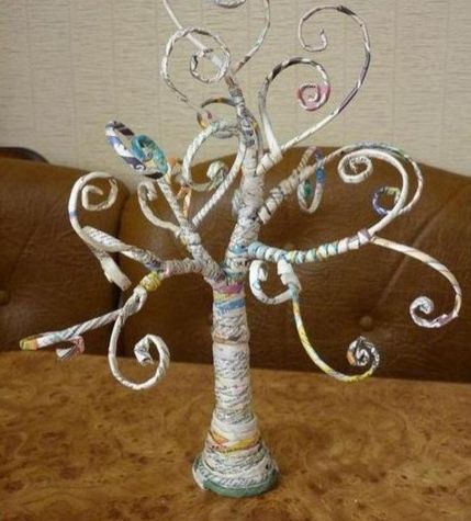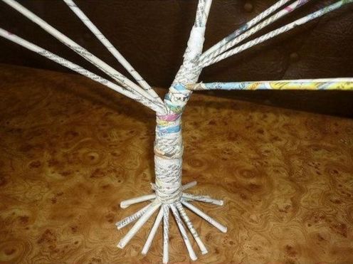 Agora, termine de criar a sua árvore. Enrole rolinho de jornal na base da árvore, para mantê-la de pé com firmeza.