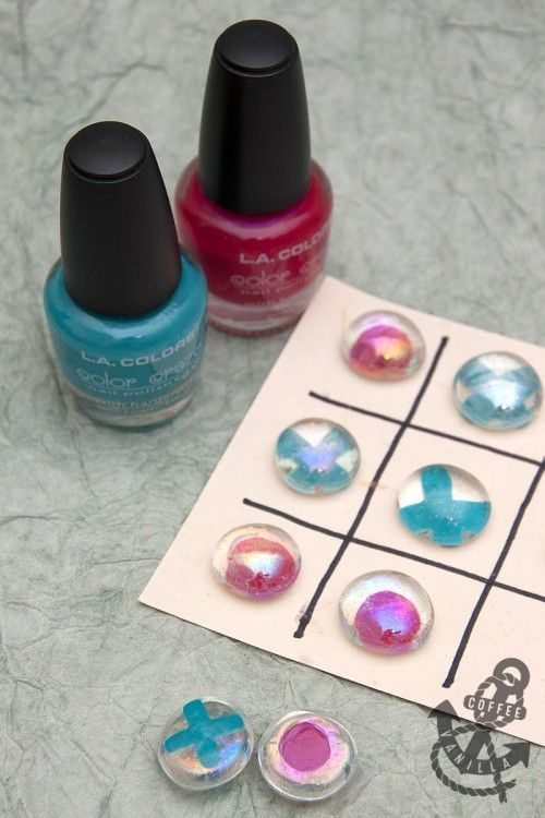 Se você quiser peças iguais, para montar um jogo da velha, por exemplo, escolha duas cores de esmaltes e faça “Xs” e “Os” na parte de baixo do seixo. Ou escolha imagens ou letras iguais, recorte e cole em seus seixos. E sempre deixe a cola secar muito bem antes de manusear novamente a sua peça e continuar com a confecção de seu trabalho.