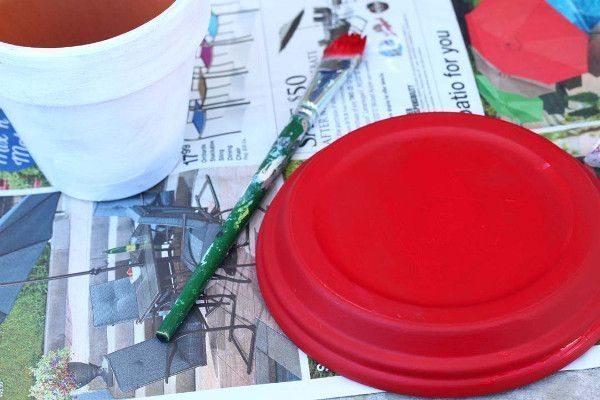 Forre o local onde você vai trabalhar com a sua peça, com jornal velho, papel velho, papelão ou plástico. Pinte o pratinho com a tinta vermelha ou com a cor de sua preferência, para ser o topo do seu cogumelo estilizado e pinte o vasinho com a tinta branca, para ser a base do cogumelo. Se você quiser uma cor mais forte e intensa, aplique duas ou até mesmo três camadas de tinta, porém sempre deixando a tinta secar muito bem entre uma camada e outra. E deixe a tinta secar muito bem antes de manusear novamente a sua peça e continuar com a confecção de seu trabalho.