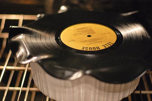 Logo após, quando a borda do disco começar a deformar um pouco, criando as ondulações, retire a peça do forno, com muito cuidado para não se queimar, e utilizando algum pano de cozinha para não queimar os dedos. Não deixe o seu disco de vinil muito tempo dentro do forno para que o vinil não derreta e escorra, por isso a necessidade de ficar olhando como o disco está durante todo o processo.