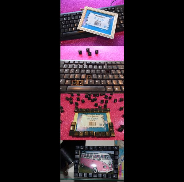Comece separando todos os materiais que você vai utilizar em seu artesanato. Retire as teclas do teclado. Se você quiser pode fazer uma sequência de letras ou números. Para finalizar a sua peça, cole as teclas na moldura do porta-retrato, com a cola escolhida. Se a moldura for larga, cole duas ou mais fileiras de teclas. E está pronto!