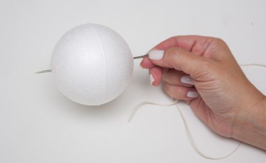 Comece cortando 40 cm de fio encerado e passando na agulha de frivoleté. E passe a agulha, juntamente com o fio, atravessando a bola de isopor de um lado para o outro.