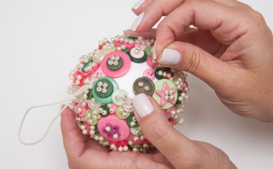 E proceda assim até cobrir totalmente a bola de isopor com os botões com os alfinetes enfeitados com as pérolas.