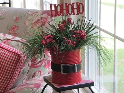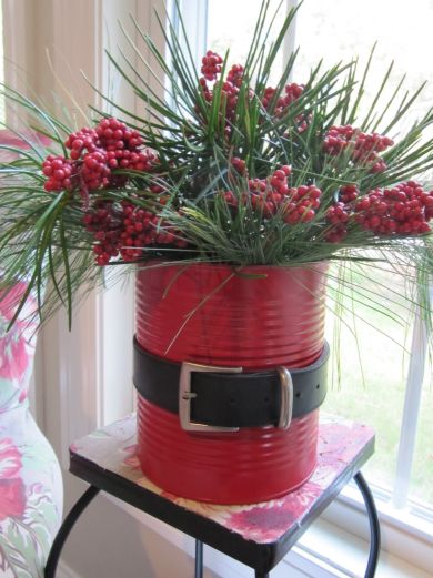 Para fazer este lindo enfeite natalino você irá precisar de: tinta spray vermelha; lata de leite; cinto preto; fivela (caso você só possua um pedaço do cinto, sem fivela); e flores para colocar dentro do “vasinho” do papai Noel que você irá criar.