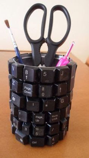Um teclado comum pode revestir um porta-canetas, com você colando teclas ao redor de uma lata. Personalize as garrafas que você for pintar escrevendo um nome, uma palavra ou uma mensagem com cola quente na garrafa antes de pintá-la.