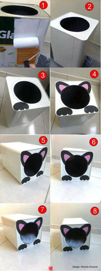 Retire toda a tinta de dentro da lata, aplicando produto específico e lavando muito bem. Não deixe o cheiro de tinta dentro da lata para não prejudicar o seu gatinho ou cachorrinho. Pinte a lata por fora e pinte detalhes que quiser. Coloque a almofada dentro. E na abertura da lata, se for necessário, aplique algo para que não fique pontas, para não machucar o seu bichinho.