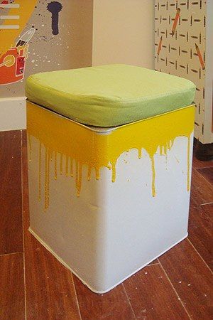 O artesanato de reciclagem fácil de fazer pode contar com puff feito com lata de tinta reaproveitada e uma espuma como assento.