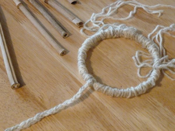 Logo após, termine de revestir a argola. Se quiser, faça três cordões de correntinhas de crochê, ou amarre vários fios torcidos, se você não souber fazer crochê. Junte todos os cordões na parte superior, para poder pendurar posteriormente.