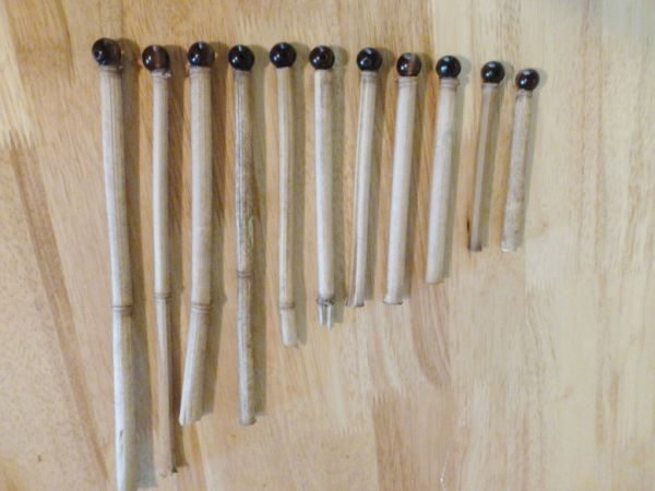 Agora, serre os pedaços de bambu com tamanhos decrescentes. Em seguida, cole as contas escolhidas nos pedaços de bambu, com o auxílio da pistola de cola quente, e com os furos das contas devendo ficar nas laterais.