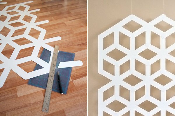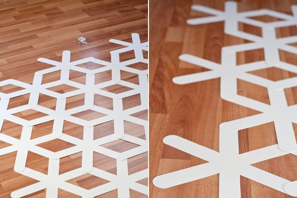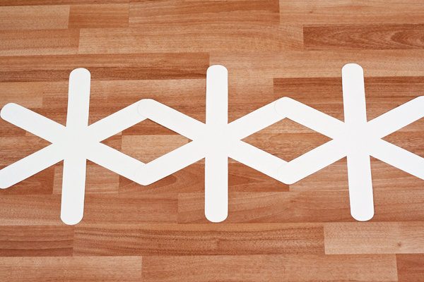 Em seguida, com o auxílio da fita adesiva dupla face, comece a unir um “floco de neve” ao outro. Comece unindo os “flocos de neve” para criar a largura da sua peça, com o tamanho que você desejar.