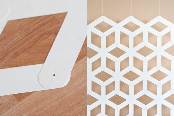 Logo após, para finalizar a sua peça, nas pontas que ficarão para cima, fixe um pedaço de fita adesiva comum na parte detrás e faça um furo. Passe pedaços de fio de nylon transparente pelos furos, faça nós e pendure a sua peça. E está pronto!