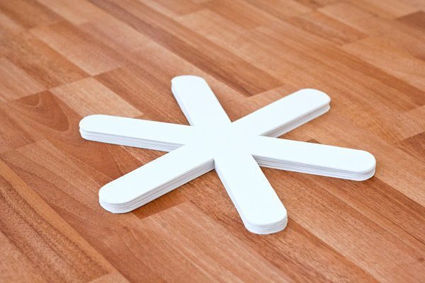 Comece separando todos os materiais que você vai utilizar em seu artesanato. Depois una as partes do molde, com o auxílio de pedaços de fita adesiva, até formar um “floco de neve”. Então, comece a transferir o molde de “floco de neve” para a cartolina escolhida. Lembrando que neste exemplo a cartolina escolhida possui a cor branca, porém você poderá fazer a sua peça decorativa com a cor que você preferir.