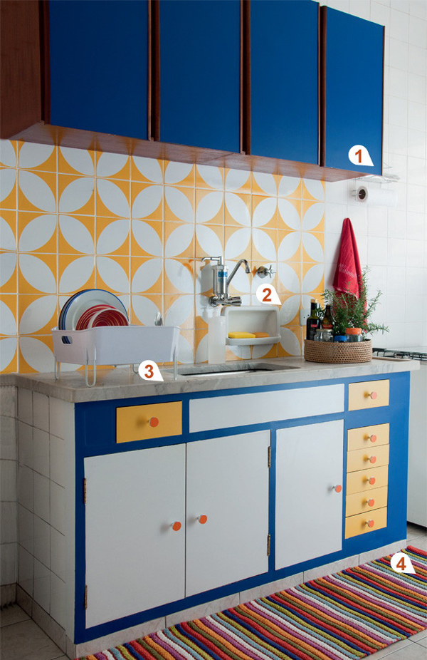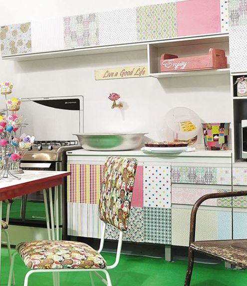 Caso o seu orçamento esteja apertado, você pode trocar o adesivo para armário pelo papel contact, cortando-o com o formato desejado e fixando-o não armário da mesma maneira que o adesivo específico para armários de cozinha.