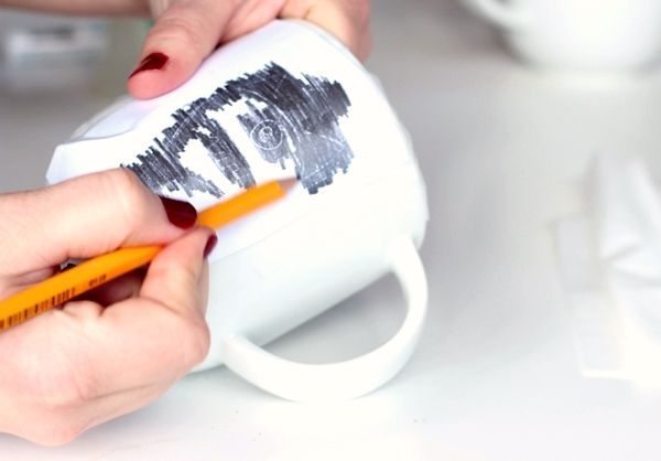 Logo após, prenda o desenho na caneca como auxílio de pedaços de fita adesiva, mas prenda o desenho com a parte em que está o grafite do lápis em contato com a superfície da caneca de cerâmica.