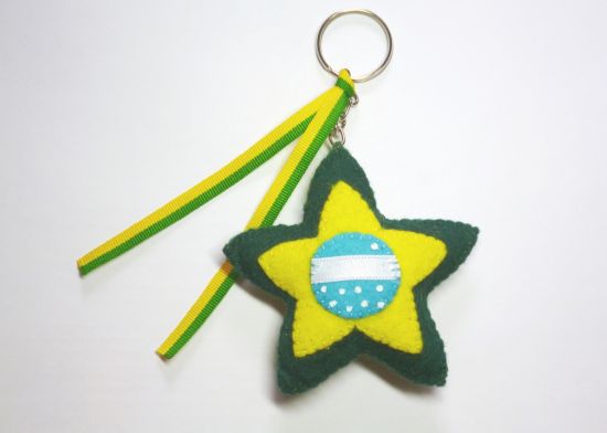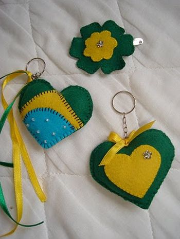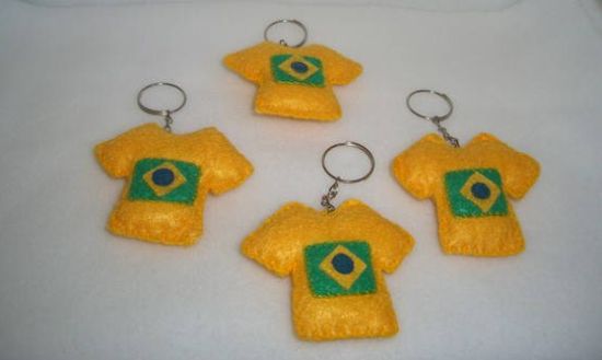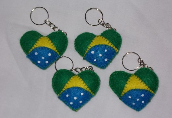 E no quesito chaveiros você pode fazer vários modelos, como camisas da seleção, bandeiras do Brasil (tradicional e estilizadas), corações, bolas e o que mais você quiser utilizando as cores da bandeira nacional e enchendo a peça com manta acrílica. Para arrematar a peça basta prender a corrente e a argolinha do chaveiro.