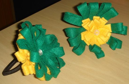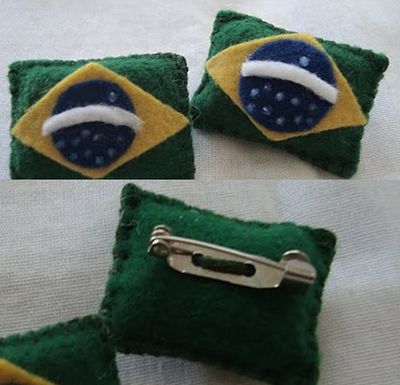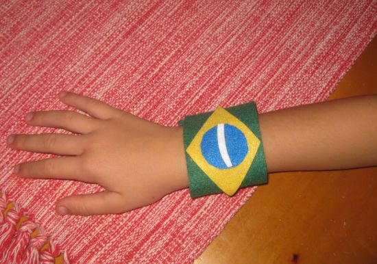 Em relação aos acessórios para você usar você pode fazer braceletes, cortando uma tira de feltro verde e montando uma bandeira e com velcro nas pontas para prender no pulso; fazer um broche, montando uma bandeira do Brasil e enchendo-a com manta acrílica; ou ainda fazer uma linda flor com tiras de feltro arrumadas como pétalas para aplicar em tiaras ou presilhas.