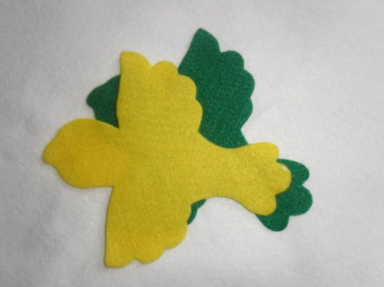 Mesmo que você não possua experiência em trabalhar com feltro você pode fazer uma bonita peça que pode ser aplicada em qualquer outro elemento, e que se trata de um pássaro em feltro que pode ser verde ou amarelo ou usado conjuntamente as duas cores. E estes pássaros de feltro podem ser aplicados em camisetas, bonés, guardanapos, almofadas, fronhas, cortinas, toalhas de mesa ou no que mais você quiser, e apenas utilizando cola quente.