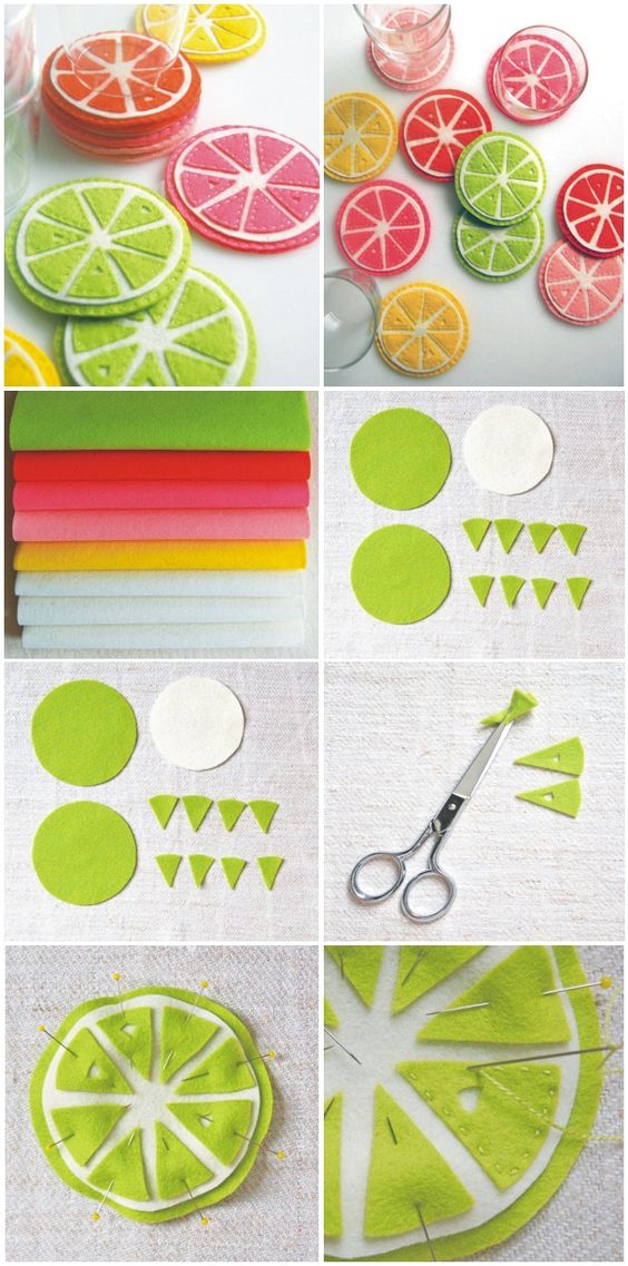 Corte círculos de feltro, com os círculos brancos devendo ser menores que os círculos coloridos. Corte oito triângulos com base arredondada para serem os gomos do seu limão ou de sua laranja. Se quiser faça alguns cortes em alguns gomos, para simular sementes. Prenda os gomos no círculo e costure ao redor, com pontos simples. Faça caseado ao redor de cada porta-copo.