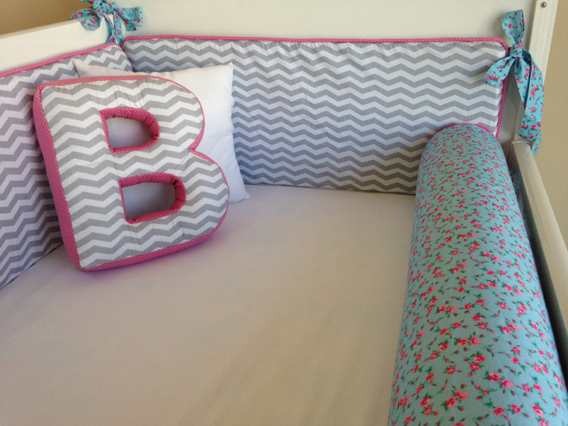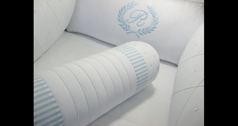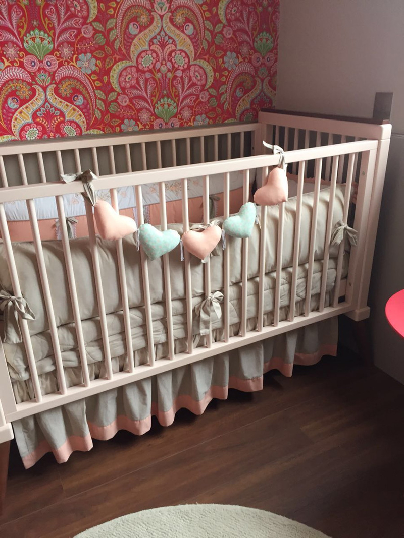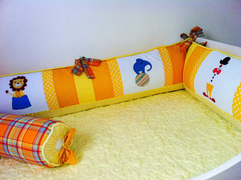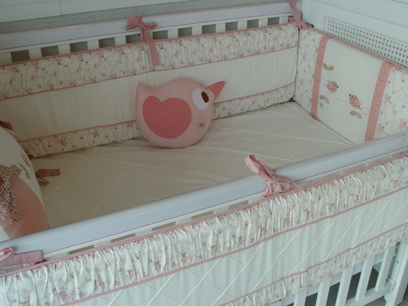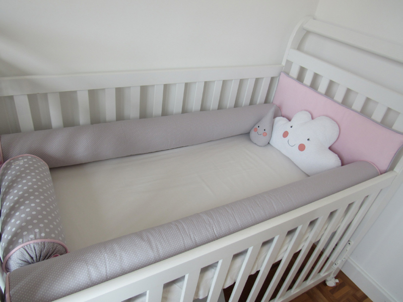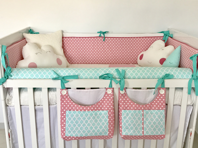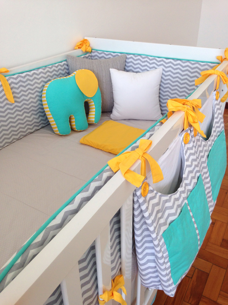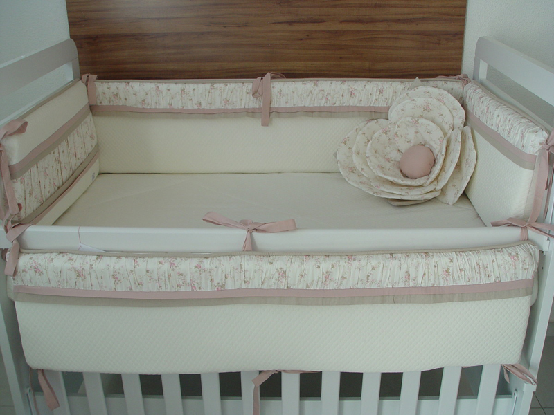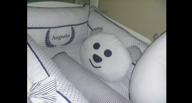 O kit para berço pode conter quantas peças você quiser. Além das almofadas protetoras que são posicionadas ao redor de todo o berço, na parte interna, você também pode fazer almofada bala, almofada de bichinho ou ainda cordão para enfeitar a parte externa do berço, como um cordão de corações de feltro ou de tecido que pode ter uma cor única ou ser multicolorido.
