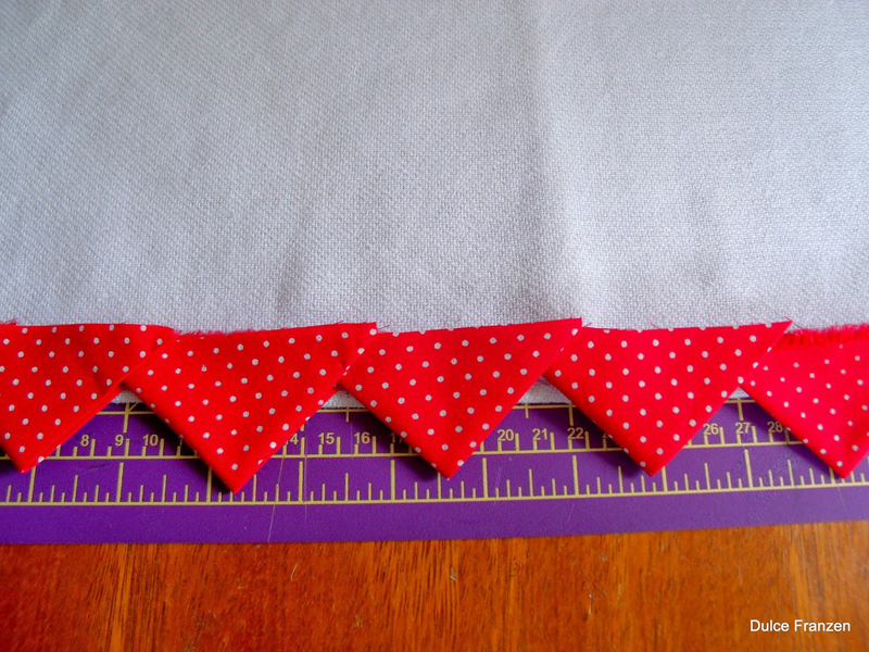 Prenda uma tira de tecido sobre os bicos, com o direto para baixo, mas com o pano de copa com o avesso para cima e a barrinha de triângulos com o direito para cima. Costure.