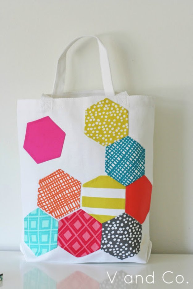 Comece separando todos os materiais que você vai utilizar em seu artesanato. Você pode customizar uma ecobag com hexágonos, seguindo o exemplo, ou customizar com os formatos desejados, como corações, estrelas ou até mesmo letras ou nomes. Recorte o tecido com estes formatos, mas com sobras, para poder virar abas para o avesso e passar a ferro, para fazer um bom acabamento. Você pode costurar ou colar estes detalhes de tecido na ecobag. Ecobag decorada vende muito mais que ecobag comum. E se você quiser, pode costurar a ecobag em casa, para faturar ainda mais.