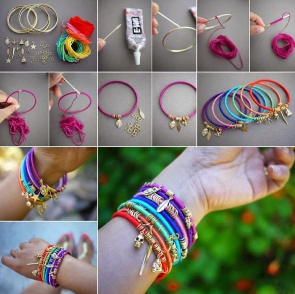 Comece separando todos os materiais que você vai utilizar em seu artesanato. Cole a ponta da linha na argola e enrole a linha ao redor da argola. Ao final, cole muito bem a ponta da linha. Coloque quantos e quais pingentes quiser em suas pulseiras. Você pode vender pulseiras avulsas ou em conjunto.