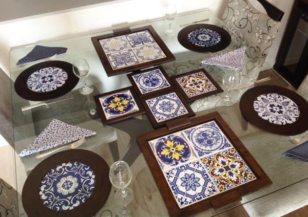 Com peças inteiras de cerâmica de piso você pode fazer jogo americano, caminhos de mesa, porta-copos, sousplats e até revestir o fundo de bandejas. Você nem precisa preocupar-se com a utilização do mesmo padrão das cerâmicas, pois atualmente “descombinar” está em alta, e também para o segmento da decoração.