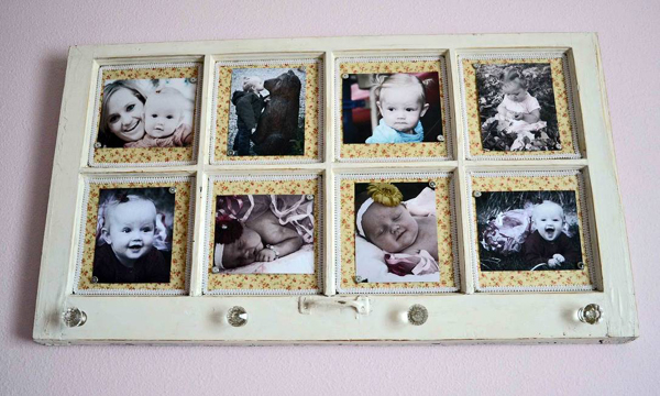Comece separando todos os materiais que você vai utilizar em seu artesanato. Se você quiser pode pintar a janela. Na parte da frente fixe ganchos decorados. Por trás dos vidros da janela fixe as fotos, aviamentos e o tecido ou papel. Na parte detrás fixe os ganchos para pendurar. E está pronto!