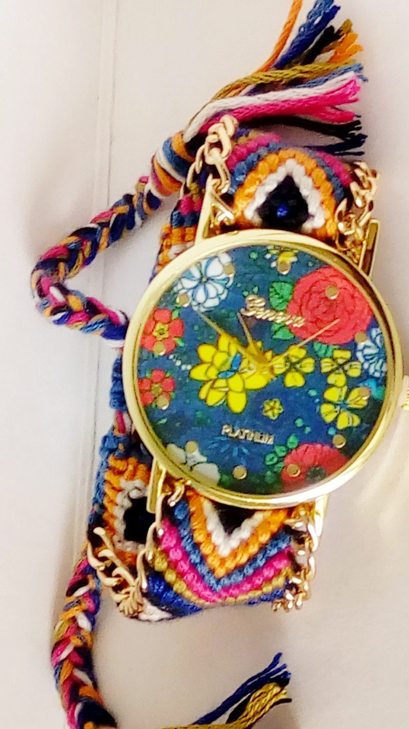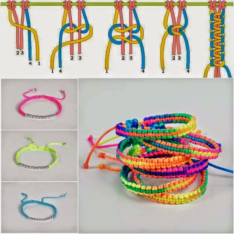 Passe dois pedaços grandes de fio colorido por um fio amarrando em uma base ou suporte, passando as duas pontas pela dobra do meio, “abraçando” o fio que está na base. Pegue o fio da esquerda e passe por cima de todos os fios, levando-o para a direita. Passe o fio da direita por cima do fio anterior e por baixo dos dois fios centrais, e por cima do último fio da esquerda. O fio que agora está na direta deve passar por baixo do fio que agora está na esquerda. Volte o fio para a direita passando-o por baixo dos outros fios, mas por cima da última laçada. Aperte este nó e siga fazendo o mesmo processo até chegar ao tamanho desejado para a pulseira. Finalize com nós e deixando pontas para amarrar no pulso.