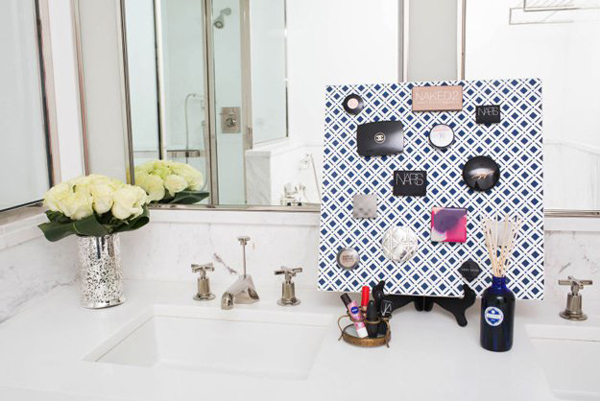 Para organizar e decorar a bancada do seu banheiro encape uma placa de metal ou uma placa de madeira com imãs colados, com papel ou tecido, e coloque-a sobre um suporte no balcão de seu banheiro.