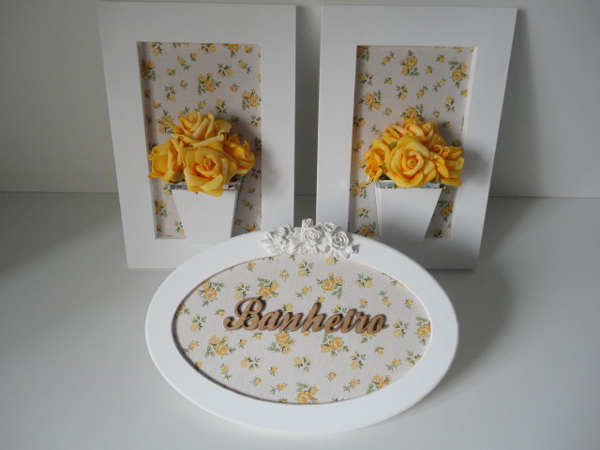 Mas você também pode customizar potes para banheiro, pode desenvolver quadros para banheiro, plaquinhas para banheiro, pode criar enfeites para banheiro e até cortinas para banheiro, entre outros.