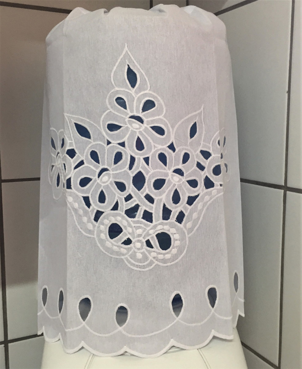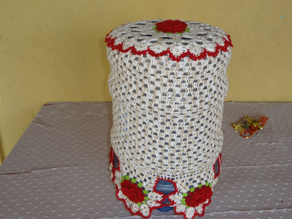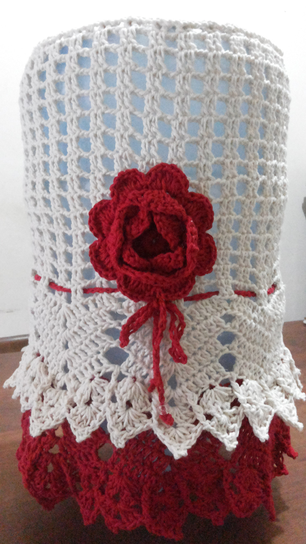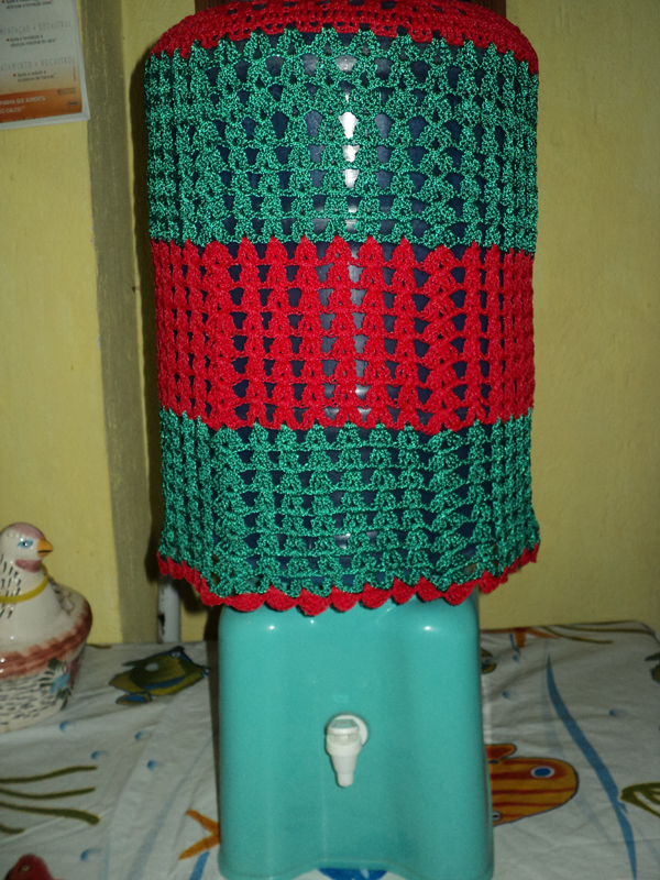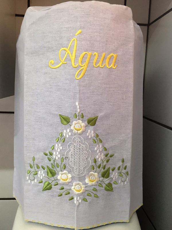 Se você quiser uma capa para garrafão de água bem sofisticada e fácil de ser feita, caso você já costure, é a capa para galão de água feita com renda. Compre uma renda que você goste, meça a circunferência do seu garrafão e a altura, transfira para renda estas medidas e quando for costurar no círculo superior do galão, vá franzindo um pouco, para que fique perfeito. Prenda antes as partes com alfinetes, alinhave e faça um teste em seu garrafão, para saber se está perfeito. E somente então costure à máquina.