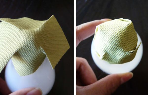 Logo após, para finalizar a sua peça, basta terminar de encapar a lâmpada comum com os quadrados de tecido dobrados em formato de ponta de lança. E está pronto!