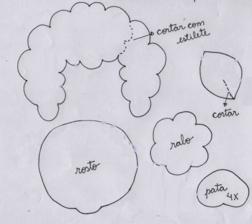 Para fazer esta simpática ovelhinha você irá precisar de: garrafa PET de 2 litros; folhas de EVAs lisos nas cores: branca, preta, bege; EVA atoalhado branco; cola quente ou instantânea; palito de churrasco; caneta permanente preta; olhinhos móveis; lacinho de fita de cetim; blush para as bochechas; tinta acrílica branca ou relevo para o detalhe no focinho; flor de bijuteria para o detalhe do laço; e molde (imagem a seguir).