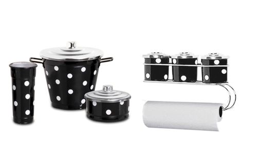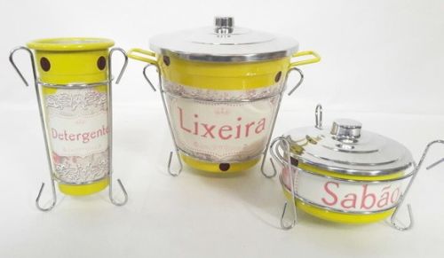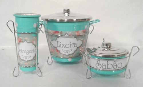 Kits para cozinhas são encontrados facilmente em lojas especializadas. Mas que tal personalizar o seu kit de cozinha? Pinte as peças para detergente, sabão e lixeira com a sua cor preferida e faça detalhes com pintura ou com decoupagem.