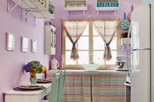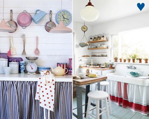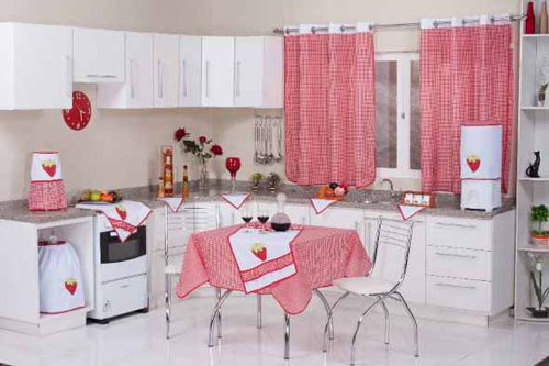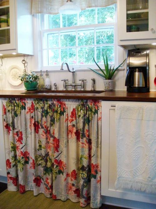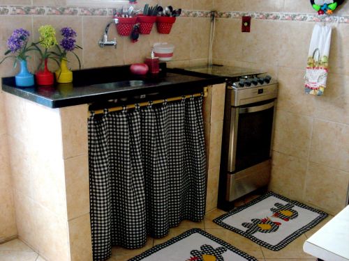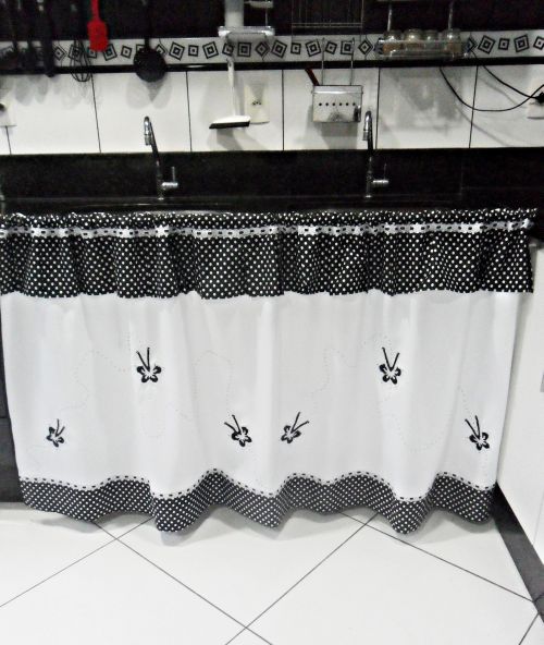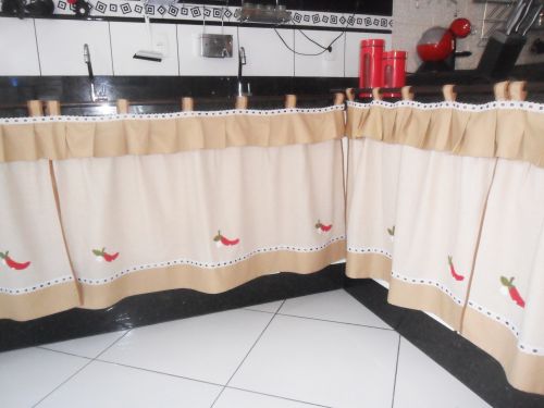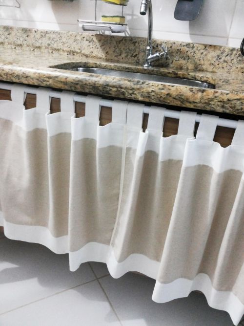 Se você fizer uma cortina para a pia da sua cozinha pode usar o mesmo tecido e fazer uma cortina para a janela que fica na parte de cima da sua pia, para fazer um jogo bem interessante.