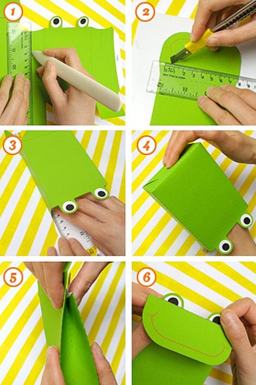 Você pode fazer uma embalagem de sapinho, com papel verde, para colocar balas dentro e presentear seus alunos no primeiro dia de aula. Se quiser facilitar a sua vida, compre um saquinho verde e cole os detalhes.