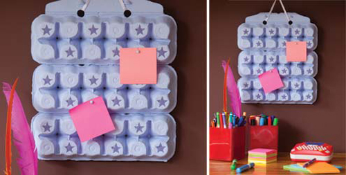 Se você é mãe e quer fazer um artesanato para o seu filho e ainda ensinar sobre sustentabilidade, faça um mural de recados com caixa de ovos. Basta pintar a caixa de ovos com a cor de sua preferência, colar adesivos ou fazer desenhos e pendurar a peça. Pendure na parede da escrivaninha, sobre a mesa.