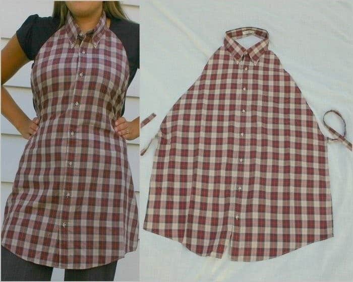 Você pode criar lindos aventais facilmente, e apenas usando uma camisa. Corte a parte da frente da camisa em formato de avental, faça a barra ao redor da parte cortada e fixe alcinhas para amarrar.