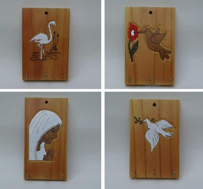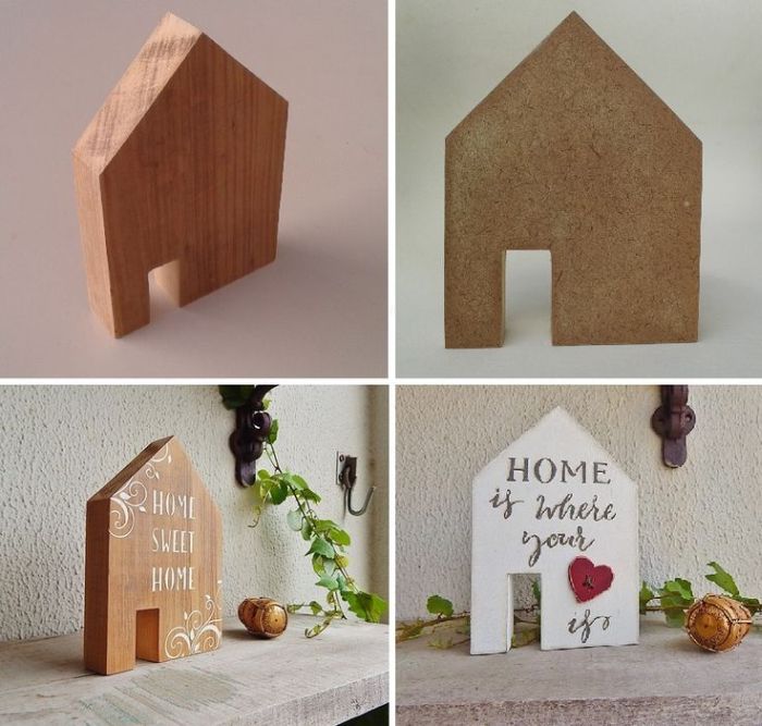 Você também pode criar caixas, suportes diversos, brinquedos, entre muitas outras peças, apenas usando madeira. Faça uma casinha com pedaço de madeira, para ser enfeite. Recorte a peça em formato de casa e decore como desejar.