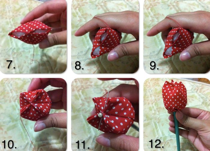 Recheie com o enchimento escolhido. Dobre a borda superior para dentro e passe a linha. Agora, costure em sentido oposto, formando 4 cantos. Para finalizar o seu artesanato com tecido, costure a pérola no meio da tulipa. E está pronto!
