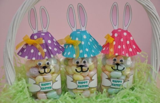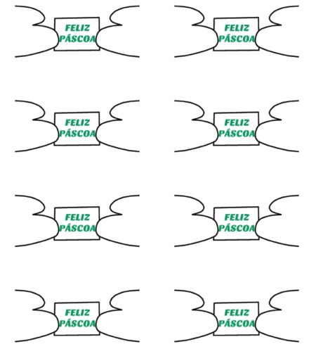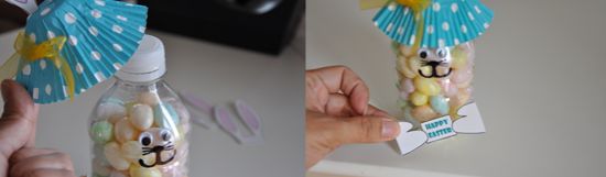Para fazer este simpático coelhinho você irá precisar de: 1 garrafa de plástico transparente pequena (ou cortando em duas partes uma garrafinha de água); forminha de cupcake; papel A4 branco (para imprimir orelhas e patinhas com quadro de recado); olhos de plástico; bolinha de algodão para o rabinho; canetinha ou caneta permanente preta; cola branca; fitilho colorido para enfeitar; e moldes (imagens a seguir, sendo que um quadro já possui escrito “Feliz Páscoa” e outro em branco, caso você queira escrever os nomes de seus presenteados).