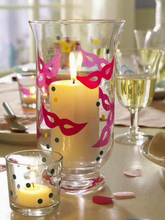 Com retalhos de papel contact você faz minimáscaras de carnaval e decora copos e outros utensílios de sua casa. Vaso de plantas também podem receber estas máscaras.