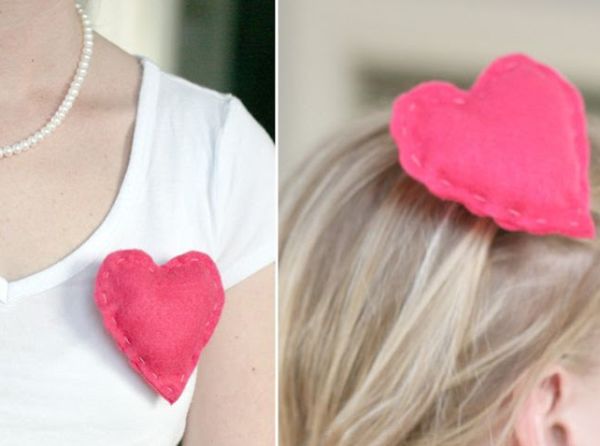 Para fazer um broche ou presilha de coração você irá precisar de: feltro com a cor de sua preferência; manta acrílica; agulha de mão; linha; cola quente; e alfinete para broche ou base para presilha. Comece cortando dois corações no feltro. Costure a mão, com a linha, mas deixando uma pequena abertura. Preencha com manta acrílica por essa abertura e termine de costurar a abertura, fechando-a. Com o auxílio da cola quente, cole o alfinete para broche ou a presilha no meio do coração e pronto!
