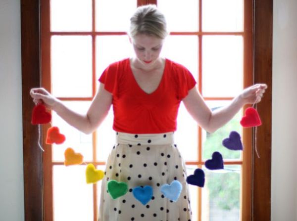 E para fazer um cordão de corações você irá precisar de: feltros coloridos; manta acrílica; máquina de costura; linha; e tesoura. Para fazer um coração, corte dois corações no feltro, costure com a máquina de costura a borda, mas deixando uma pequena abertura. Preencha com manta acrílica por essa abertura e termine de fechar a abertura. Faça quantos corações você quiser, e em diversas cores, e passe o cordão ou a linha por entre eles, para formar o cordão de coração. E está pronto!